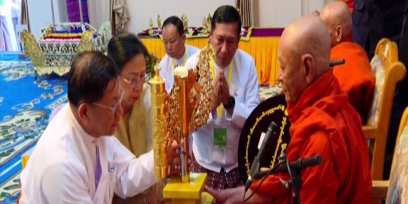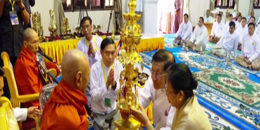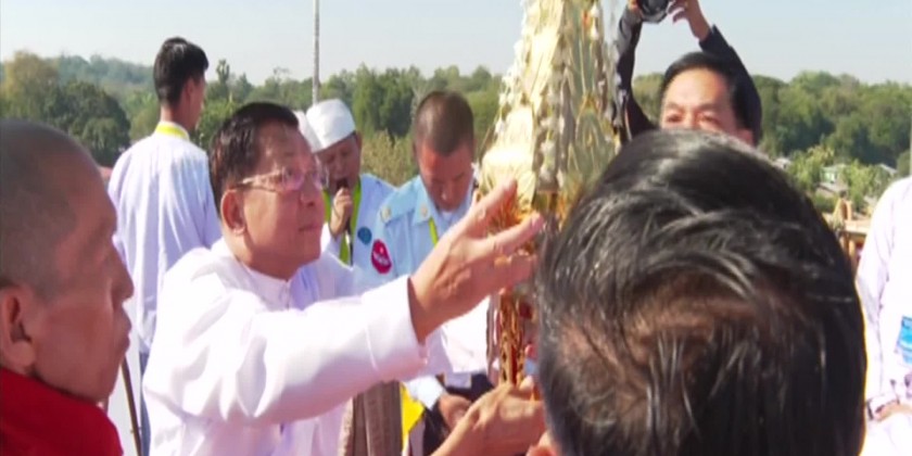 Afterward, the SAC chairman prime minister and wife offered flowers, water, candle light and lotus robe to the Buddha image resided at the south of the pagoda. Then, the members of Sangha performed the consecration ceremony of the Myotaw Hteikpan Mangala Pagoda.