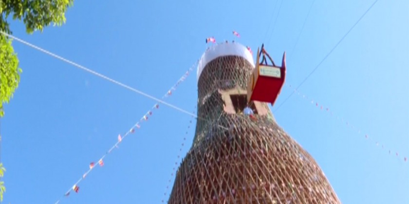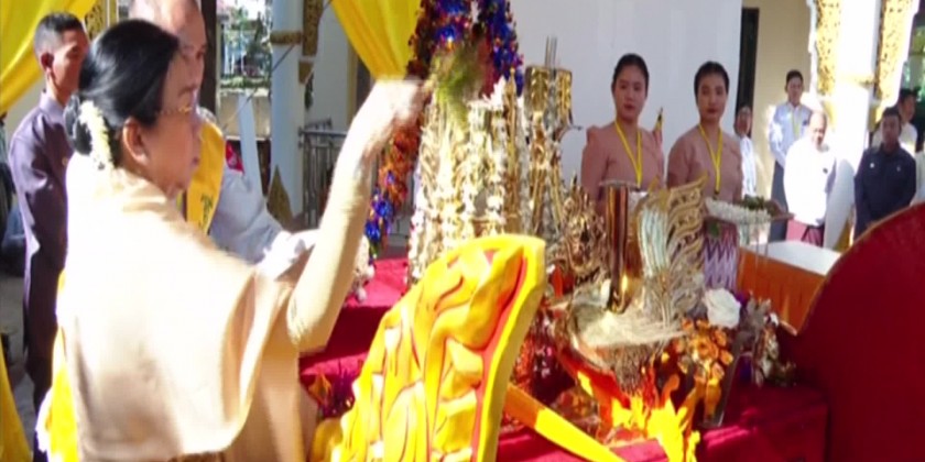 Then, the prime minister enshrined the religious objects into the repository at the auspicious time and sprinkled with scented water. Afterward, the prime minister, wife, members, attendees and local people, at the time of auspiciousness, conveyed the diamond bud and Penant shaped vane atop the pagoda by pulling the rope attached to the fly-palanquin.