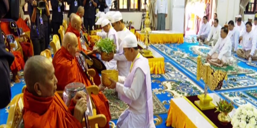 Then, the lay persons brought the Paritta flowers, water, thread, sand and scattered and tied at the precinct of the pagoda. Next, the Prime Minister and wife offered Diamond bud, Penant shaped vane and religious objects to the Wegyi Sarthintaik Sayadawgyi. Also, Council joint-secretary, Council members, Union Ministers and attendees offered offertories to the members of Sangha. Next, the congregation took the sermon delivered by the Pali Sayadawgyi and shared the merits gained.