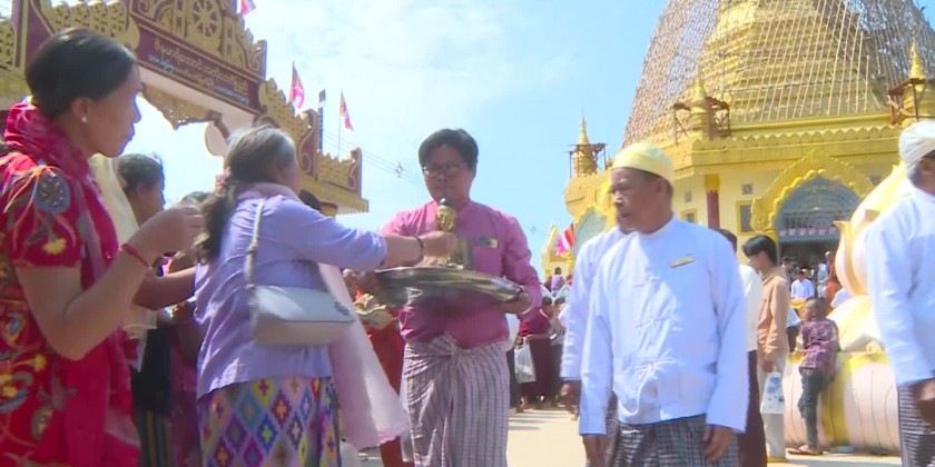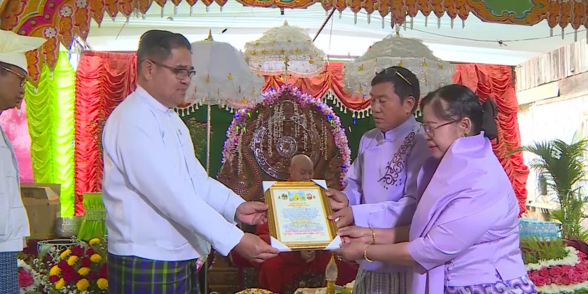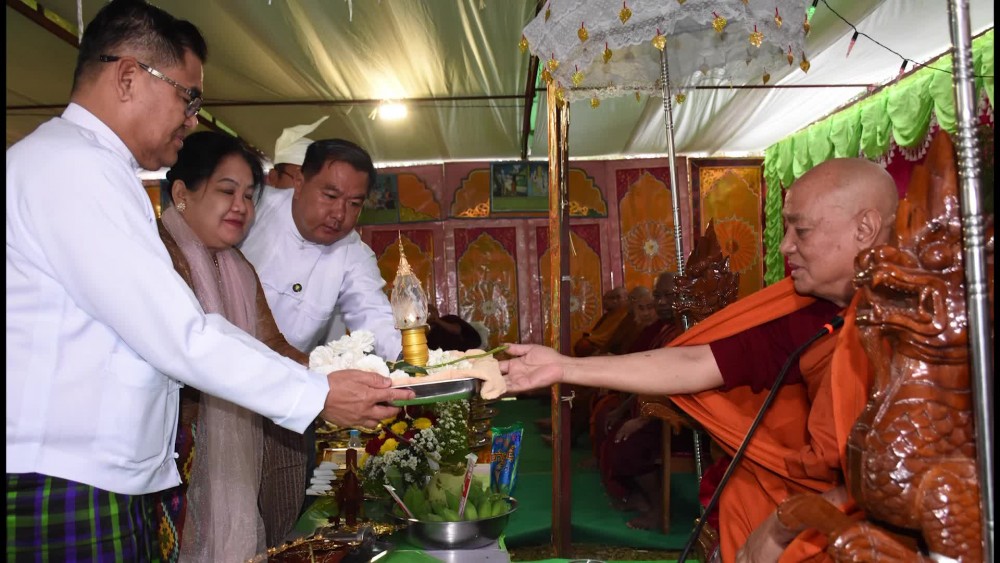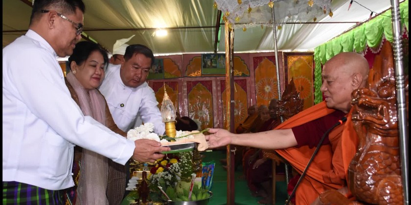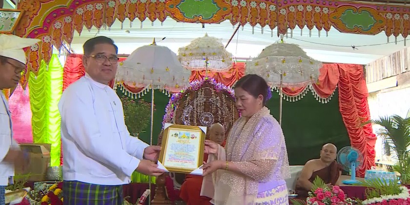 Next, the Chief Minister and wife, state chief justice and wife, state ministers and state advocate general and well wishers offered Diamond bud, Hansa, golden reliquary, pennant shaped vane and umbrellas for 8 encircled stupas to the members of Sangha, took the Paritta Suttas recited by the Sangha and sermon delivered by the Sayadaw, presenting certificate of honor to the well wishers and shared the merits gained.