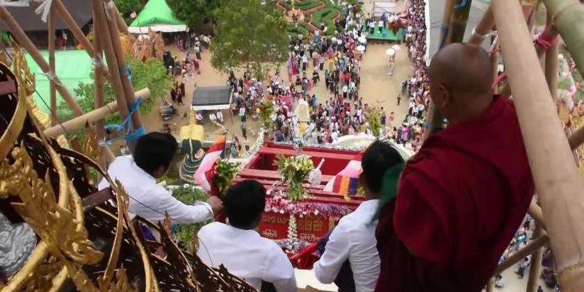 Then, the golden umbrella, Diamond bud, Hansa, golden reliquary, pennant shaped vane and umbrellas for 8 encircled stupas were hoisted atop the pagoda and encircled stupas, the banknotes were tossed in token of successful ceremony and the dry rations and offertories were offered to the members of Sangha.