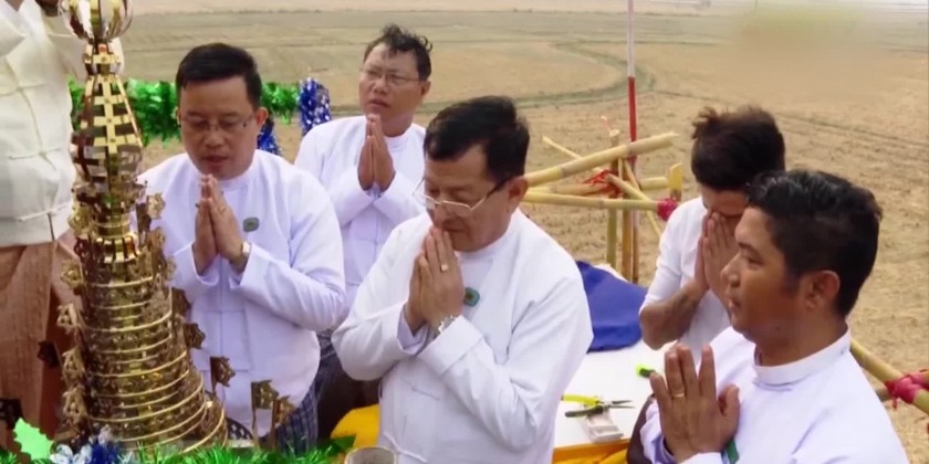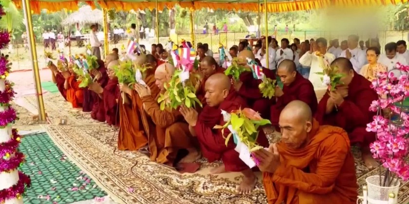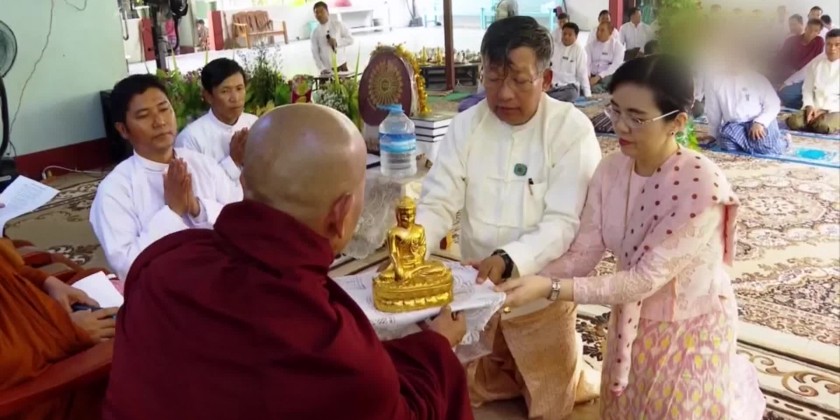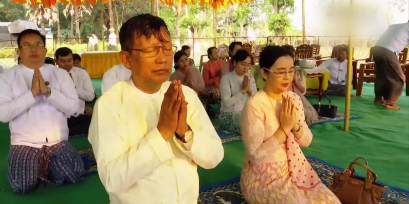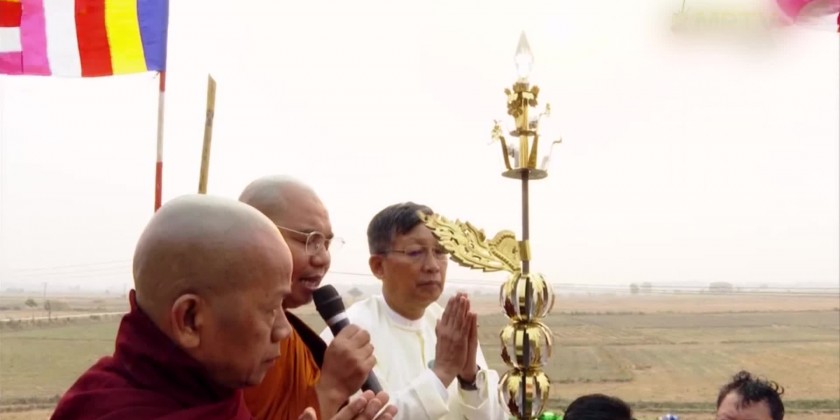 Next, the members of Sangha consecrated the pagoda. Afterward, the opening ceremony of Dakkhinathiri Township-wide fourth uninterrupted reciting of Pathana Dhamma Discourses was held at the community hall of the monastery at 9 AM. After congregation led by the Nay Pyi Taw Council Chairman observed five precepts administered by the Presiding Sayadaw of Kyun Tet Pe monastery and the master of ceremony recited the verse on virtue of Pathana Dhamma Discourses.