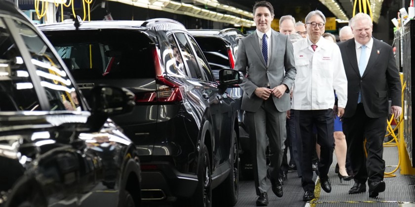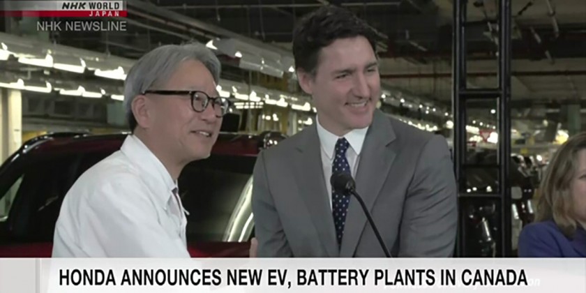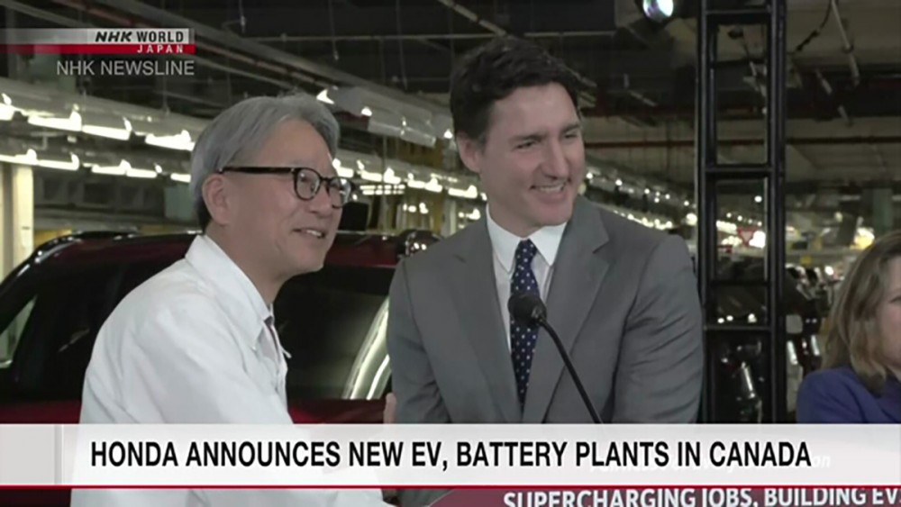 The Japanese automaker will invest about 11 billion US dollars in the operation in Alliston in the province of Ontario. Honda President Mibe and Canadian Prime Minister Justin met reporters at the site on Thursday. The automaker expects to produce up to 240,000 vehicles a year in Alliston. Production is slated to begin in 2028. Honda's goal is that all of its new-vehicle sales by 2040 will be EVs and fuel-cell models.