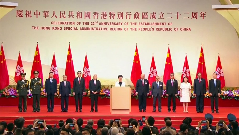 Embattled Hong Kong leader Carrie Lam appeared in public for the first time in more than 10 days to officiate at a flag-raising ceremony on Monday to mark the 22nd anniversary of the city's handover to Beijing under a deal to ensure its autonomy. Lam raised a toast after the annual ceremony with high-ranking officials as protesters gathered outside the Hong Kong convention center, the ceremony venue.