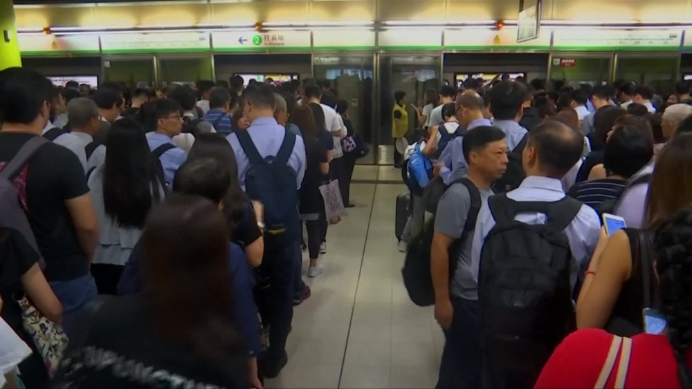 Hong Kong anti-government protesters on Tuesday delayed a train at a station in east Kowloon, causing commuter chaos for about two hours. Protesters blocked themselves in between the train's automatic doors, preventing them from closing. Hundreds of weary commuters were forced to stand in queues despite warnings of delays from Tiu Keng Leng metro station staff.