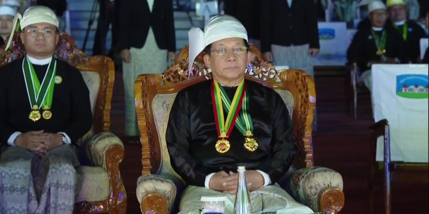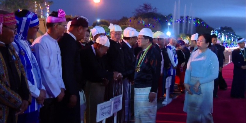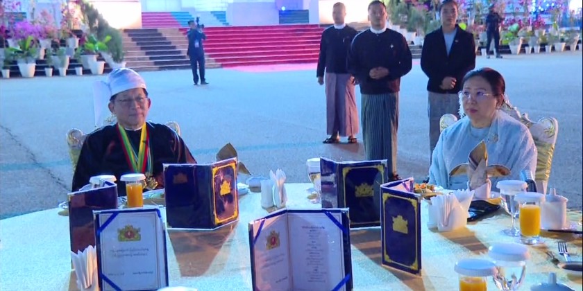 Acting President Chairman of the State Security and Peace Comission Senior General Thadoe Maha Thray Sithu Thadoe Thiri Thudhamma Min Aung Hlaing and wife Daw Kyu Kyu Hla hosted honorary dinner reception, commemorating the 79th Union Day at the facade of Nay Pyi Taw City Hall on 12th February.