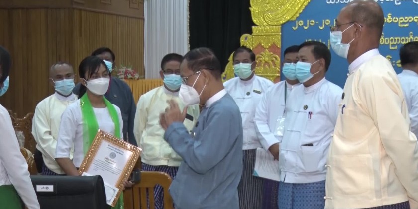 As this ceremony is especially honored the students, the students are urged to work hard with exerted efforts etc. Next, the union minister awarded the certificate of honor and cash of honor to three students who passed the matriculation examination with four distinctions and three distinctions each.