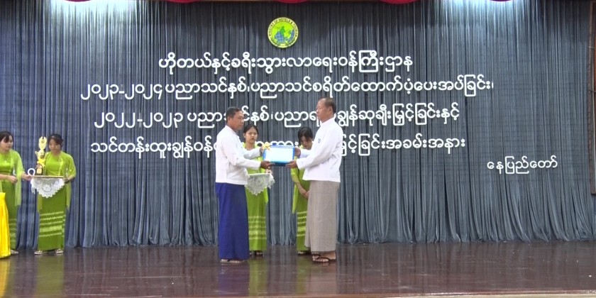 Then, the director General of the office of Union Minister awarded the gift of honor and cash prizes to the students who passed the matriculation examination with distinctions for 2022-2023 academic year and the Deputy permanent secretary presented gift of honor and cash prizes to the personnel who won the outstanding awards in the civil service trainings.
