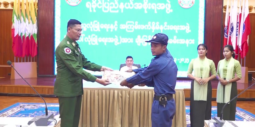 Initially, the Rakhine State Chief Minister U Htein Lin, emphasized the establishment of a state-level Public Security and Anti-Terrorism Supervisory Committee in Rakhine State. He stated that similar committees have also been formed at the district, township, and ward levels within Rakhine State. He mentioned the formation of the security group for Sittwe, which has also conducted training sessions. The monthly allowances for the urban security group members are being provided, along with other benefits. This recognition is awarded because they have diligently performed their duties since the establishment of the group. He urged collaborators to work together to strengthen the capabilities of the urban security personnel.