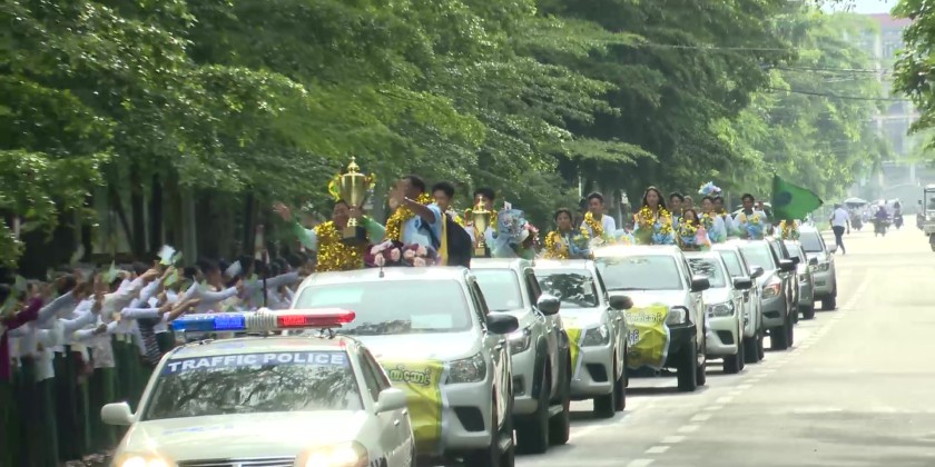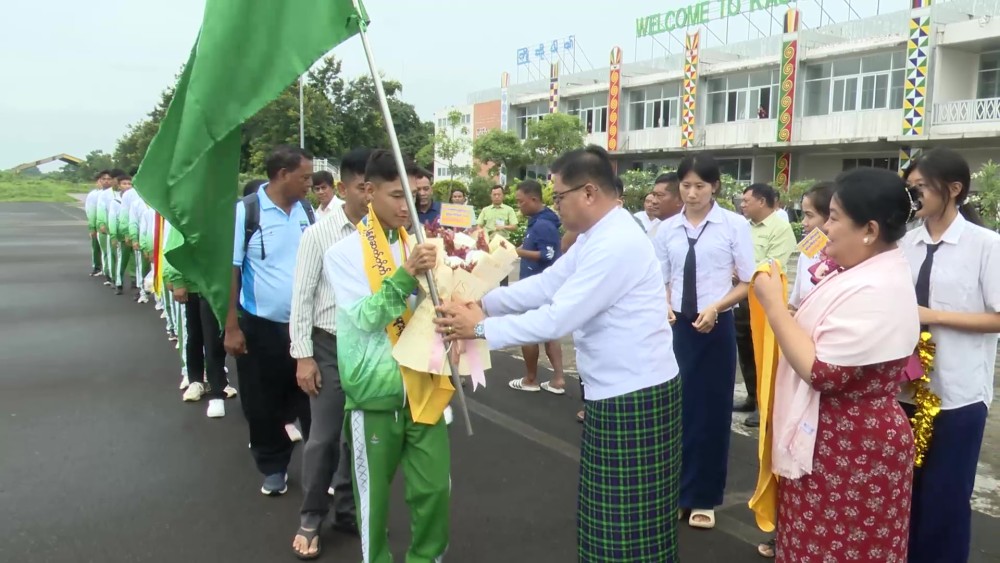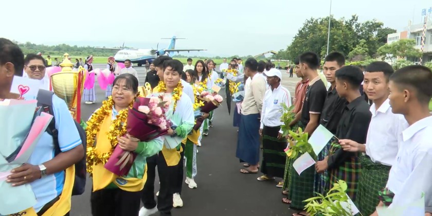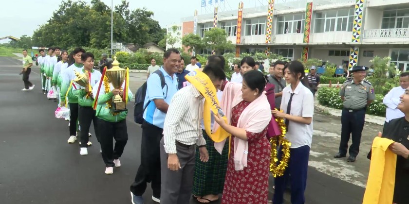 They were grandly and joyfully welcomed at Myitkyina Airport by Shan State Chief Minister U Khet Htein Nan and his wife, the Chief Justice of the State High Court, State ministers and their wives, the State Advocate General, state/district/township level departmental officials, officials from various sports sub-committees, students, drum and bugle corps, pom-pom groups, ethnic traditional dancers, and aerobics groups. Next, the state-honored team, along with their trophies and medals, was paraded through Myitkyina in vehicles from Myitkyina Airport.
