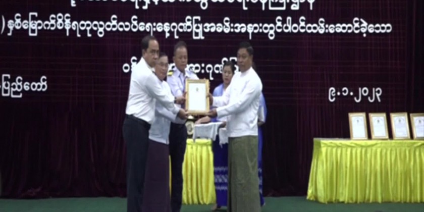 The State is building in line with the motto “Keep Moving Forward to Achieve Our Goal” and the Union Minister called for the staffs to serve the interests of the nation by keeping good tradition. Later, the Union Minister presented certificates of honour and honouraria for the 2nd winning parade float in the Diamond Jubilee Independence Day ceremony as well as certificates of honour to parade troops, flag bearers and those who participated in the Committee for Organizing Commemorative Booths and Transportation Sub-Committee.