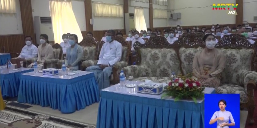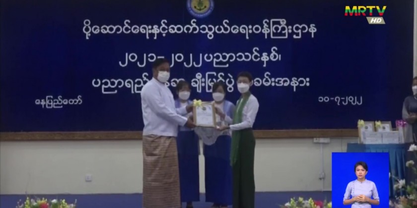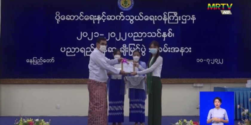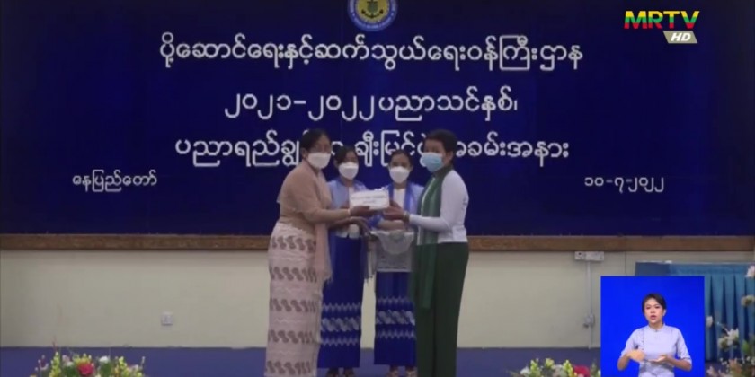 Union Minister Lt-Gen Tin Aung San attended this honouring ceremony at the Ministry in Nay Pyi Taw and urged the students to benefit the community, to serve the interests of the country, to have purpose for life, good intentions and goals, to work diligently with the right path to achieve the goals, to continue to study higher education and to keep learning in order to keep up with the times.