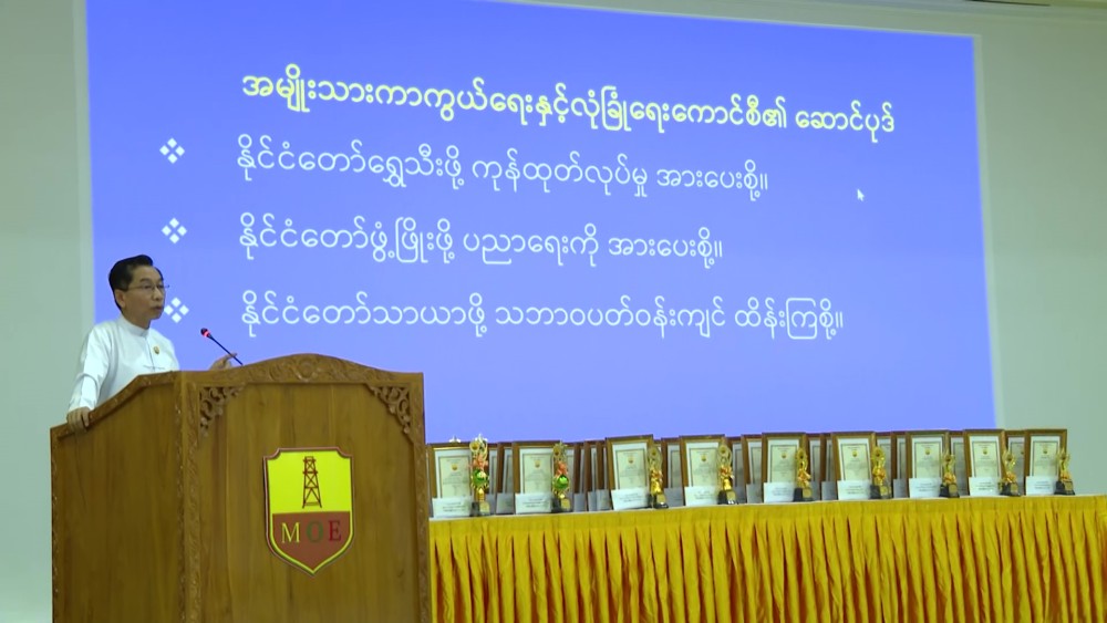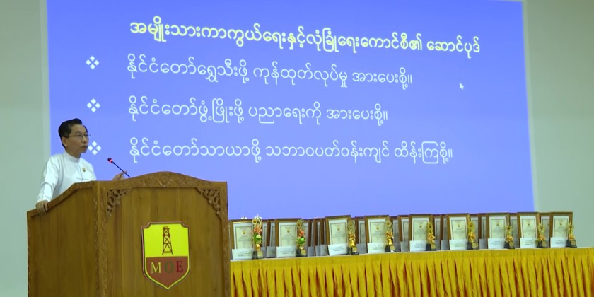 An award ceremony to honor the children of staff from the Ministry of Energy who successfully passed the 2024-2025 academic year matriculation examination was held at the Yatanā Hall of the Ministry of Energy in Nay Pyi Taw on Wednesday. Union Minister U Ko Ko Lwin attended the event and delivered a speech.