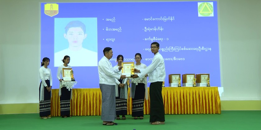 Afterwards, on behalf of the students, Maung Phone Kyaw Myat, a distinction student with six distinctions, expressed words of thanks. The award-winning students then honorably performed the Myanmar Student Song. The Union Minister, Deputy Minister, Directors General, and Managing Directors took commemorative group photos with the award-winning students.