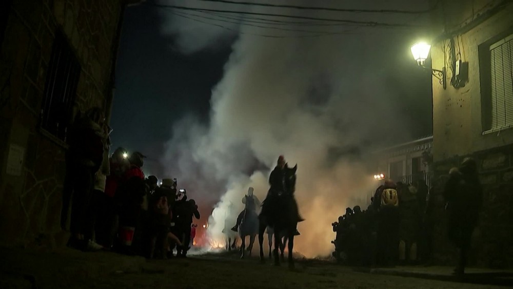 Over one hundred horses jumped through bonfires in a purification ceremony on Wednesday during the Spanish festival of "Las Luminarias" in northwest Madrid. The traditional celebration takes place every January 16. According to tradition, the horses are 'purified' by the smoke and flames of the bonfires for the coming year. As part of the preparation, festival participants braided the manes of their horses to protect their hair from getting burnt.