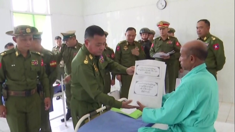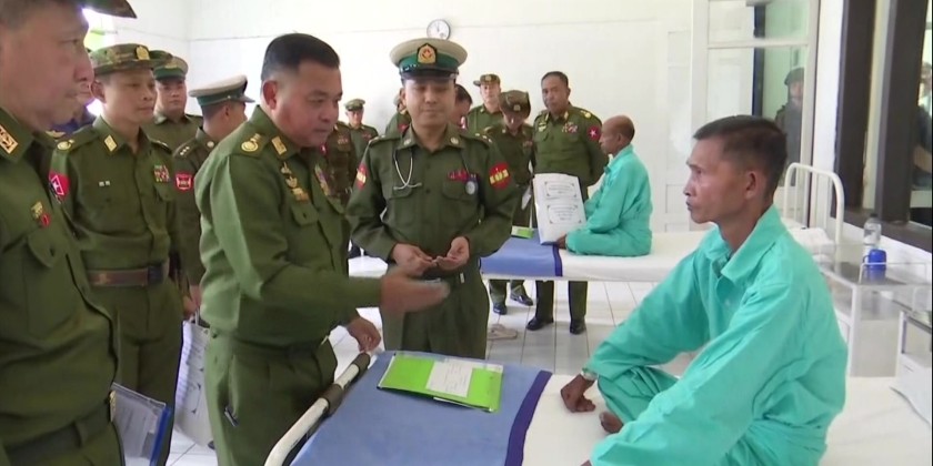 Commander-in-Chief of Defence Services General Ye Win Oo and his wife visited the military hospital in Mongphyat on Friday. They met with officers, Tatmadawmen, police personnel, and their families receiving treatment, and comforted them. Wife of the Commander-in-Chief also visited the women and child wards to comfort the patients. They also provided food, medical supplies, and cash assistance, and toured the hospital.