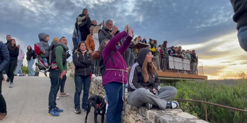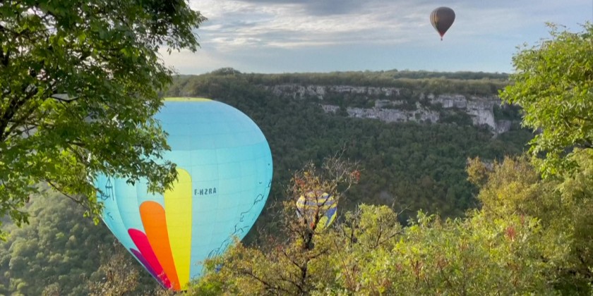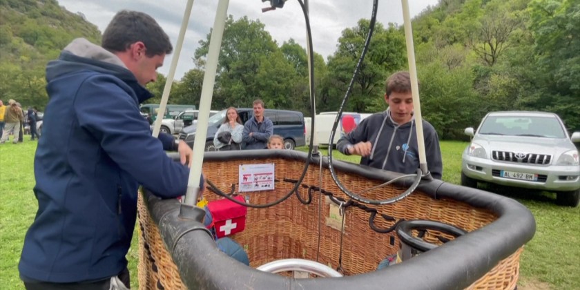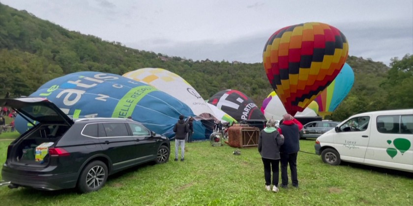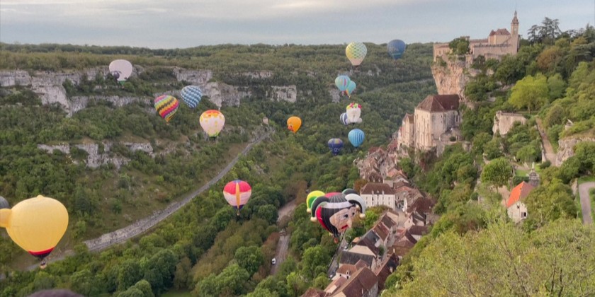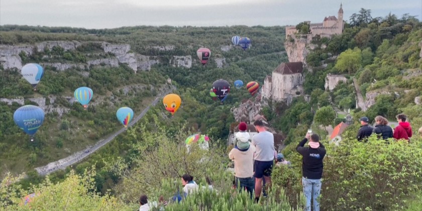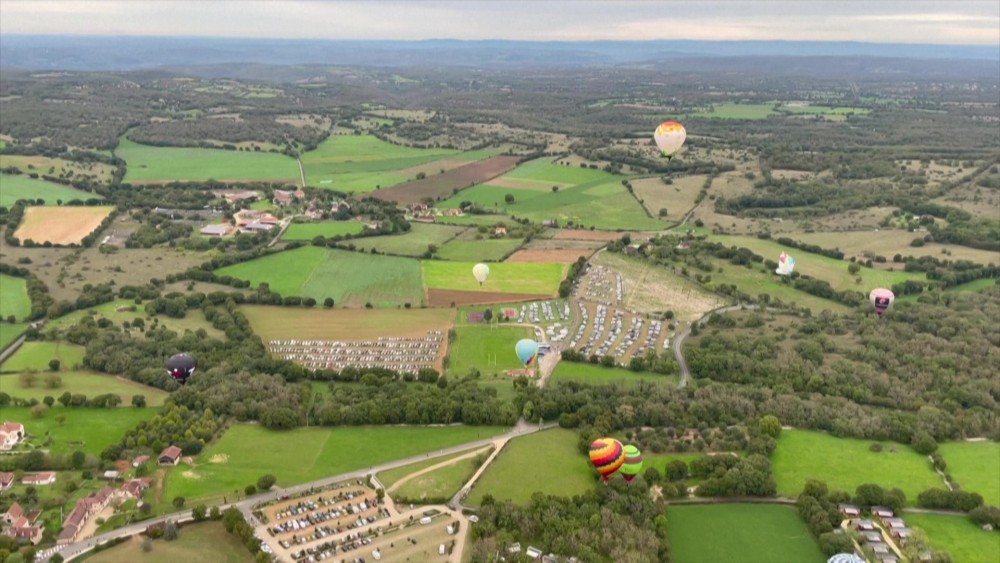 About two dozen hot-air balloons fly over the French medieval town of Rocamadour in France on Sunday. The event held as part of the "Montgolfiades" festival organized by a local group called Rocamadour Aérostat. It feature colorful hot air balloons taking flight, creating spectacular aerial displays against scenic backdrops, often with various animations and competitions for pilots.