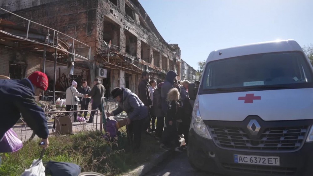 Dozens of residents of the eastern Ukrainian city of Izium gathered to receive food packages and other aid on Wednesday as electricity, gas and running water remained cut off in the city.