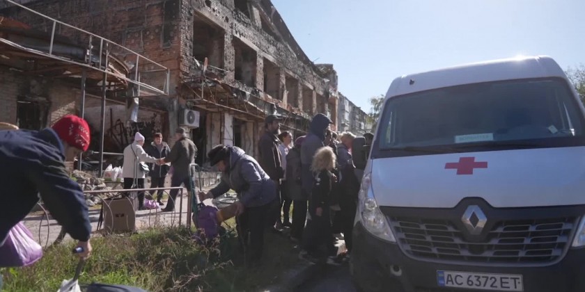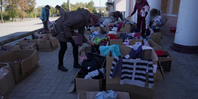Volunteers distributed bread, apples, toiletries and other necessities as people scrambled to receive the much-needed aid. Few stores are operating in Izium, and many of those who have stayed in the city have little money to purchase necessary goods.