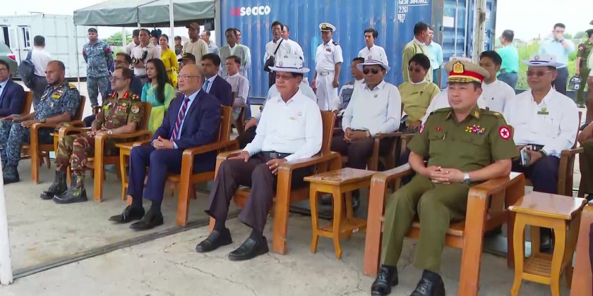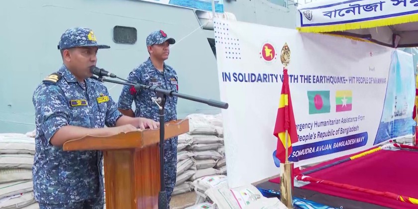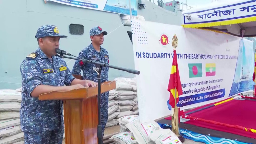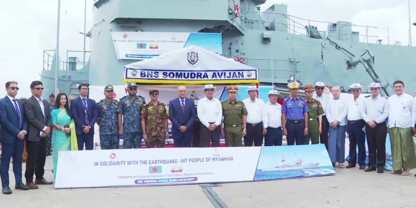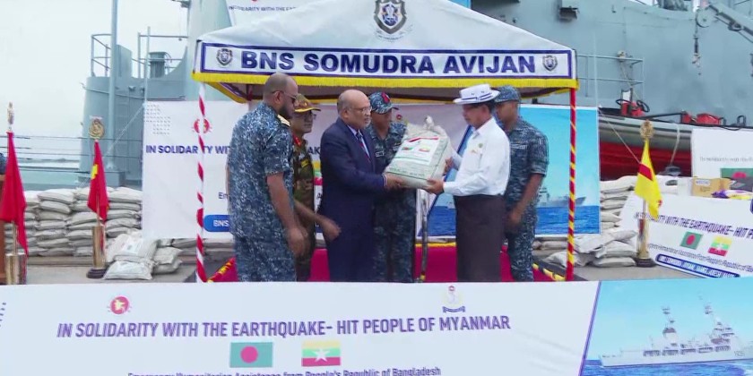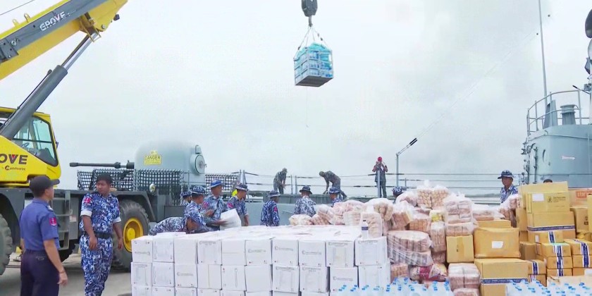 The Bangladesh Navy vessel arrived at Yangon Thilawa Port on 11 April, carrying about 120 tons of humanitarian assistance and food supplies for the earthquake-affected victims.