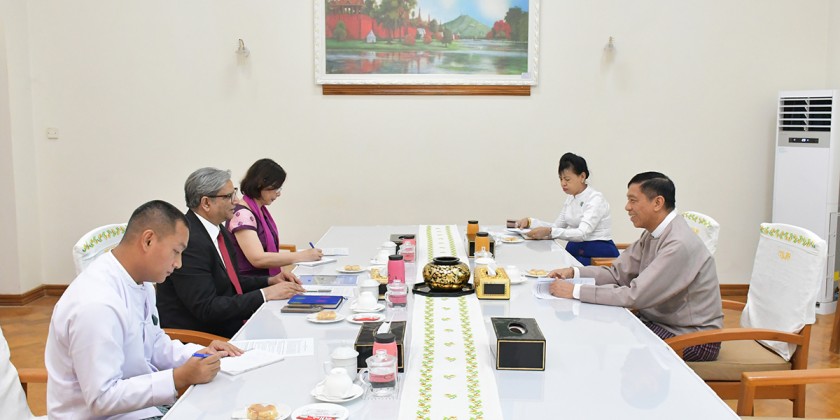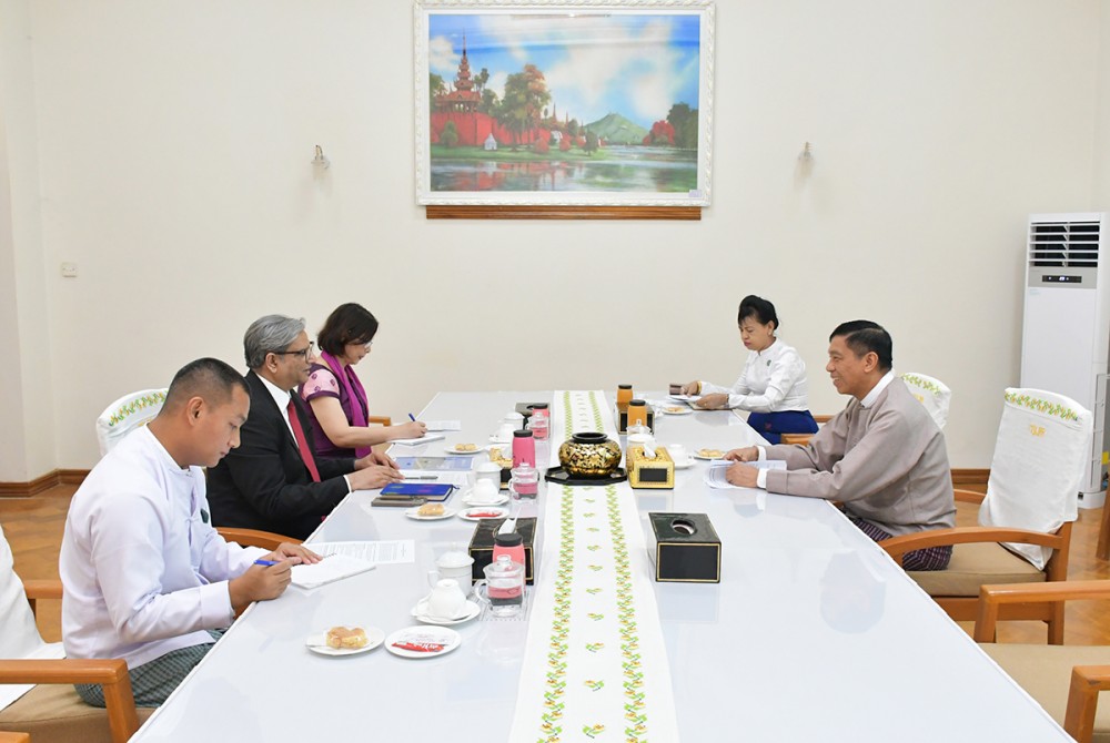 Union Minister for Social Welfare, Relief and Resettlement Dr. Soe Win met with Mr. Sajjad Mohammad Sajid, Head of UNOCHA in Myanmar, and party at the Ministry on Wednesday.