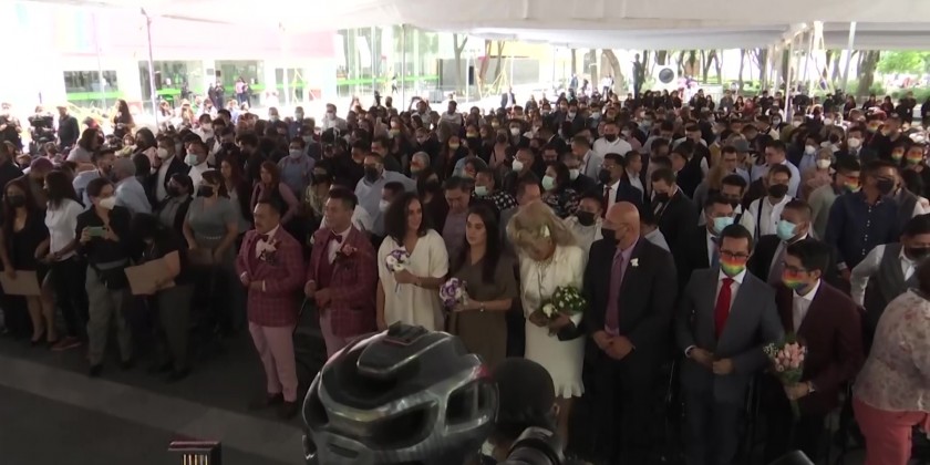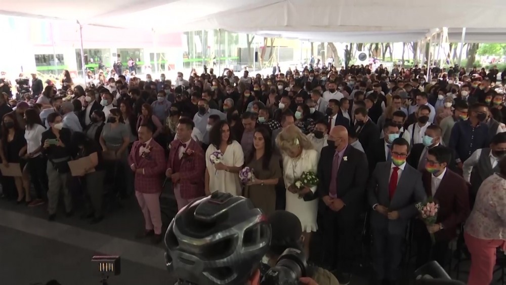 Hundreds of same-sex couples got married in a mass wedding ceremony in Mexico City on Friday, kicking off LGBT Pride celebrations.