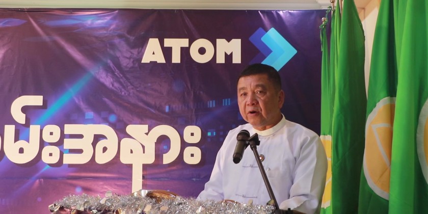First, the Mon State Chief Minister, Chief Justice of State High Court, and a member of ATOM Myanmar Limited's management team cut the ribbon to officially open the ICT Lab. Next, Mon State Chief Minister U Aung Kyi Thein gave a speech at the donation ceremony.
