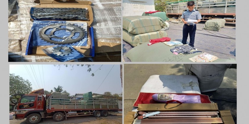 On 5th March, four kinds of goods including Controller and medicines at Yangon International Airport, 50 boxes of instant vermicelli and Nissan-Diesel motor vehicle and 1050 Kilograms of Picnic Cooler and a Mitsubishi Fuso motor vehicle at Mayanchaung permanent checkpoint in Mon State, motor cycle spare parts, foodstuff and consumer goods and two motor vehicles at 16 miles Kyaukchaw checkpoint in Mandalay, two motor vehicles of Toyota Surf and Mazda Tribute without license at the entrance checkpoint of Magway Township, over 34 tones of illegal timbers in Pakhokku and Salin Townships, Toyota Wish vehicle without license in Insein Township and Toyota Succeed vehicle without license in Mingalar Taung Nyunt Township of Yangon Region, totaling 16 kinds of goods including industrial machenary, auto parts, electric fans, cosmestics and a Volvo (Tractor Head) and a trailer heading ot Yangon from Myawady Towship, On 6th March, 1.63 tones of illegal timbers in Phyu and OakTwin Townships of Taunggo District were confiscated.