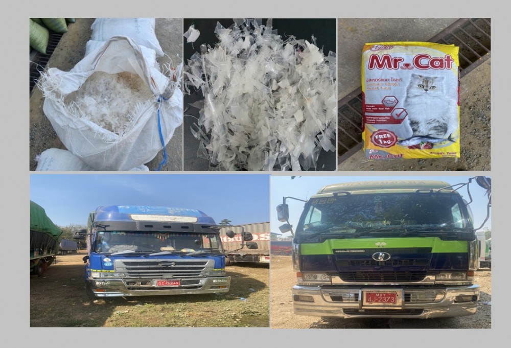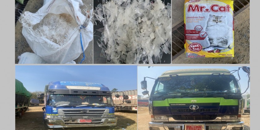 On 23 and 24 January, a combined team nabbed 31,120 kilogrammes of purified plastic scraps and 600 kilogrammes of feedstuffs from 2 vehicles heading from Myawady to Yangon. On 25 January, a total of 1.42 tonnes of illegal teak doors was seized. On the same day, officials at the 16th-Mile Kyaukchaw combined checkpoint captured electrical goods, industrial materials and machinery parts without official documents.