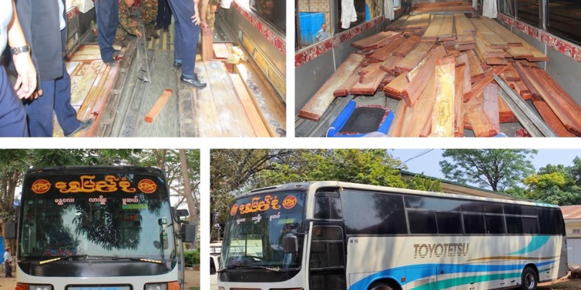 On 25 March, the Lashio Township Customs Department inspection team near the oriental highway tollgate nabbed a total of 0.8516 tonne of suspected gum-kino tree and 0.9632 tonne of suspected teak that were illegally carried from a Toyotetsu bus heading to Muse from Mandalay. On 31 March, a total of 23.08 tonnes of illegal teak, 8.51 tonnes of hardwood and 3.42 tonnes of other timbers was seized in Nyaunglebin, Daik-U, Pyu and Letpadan townships.