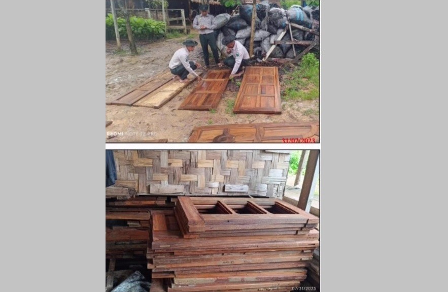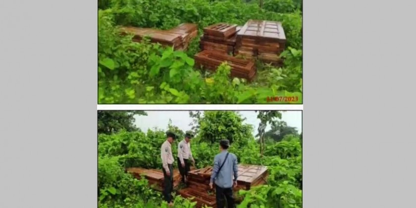 A Mitsubishi Fuso and a Hyundai van, headed to Myawady from Yangon carrying 200 bags of white sesame and 300 bags of peanut on the Moppalin-Sutpanu-Ingabo detour and a Higer bus, headed to Yangon from Hpa-an, carrying 7,560 bags of Wai Wai instant rice vermicelli on 1 August, a Nissan Diesel vehicle, headed to Hpa-an from Myawady, carrying 250 bags of Xuemei Monosodium Glutamate at the Kawkareik (Tadakyoe) checkpoint, a total of 14.494 tonnes of illegal teak and 3.103 tonnes of hardwood in Bago and Nyaunglebin districts on 2 August.