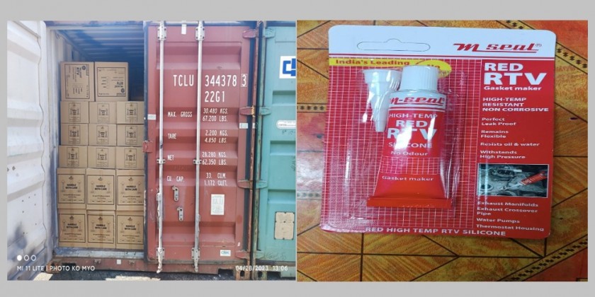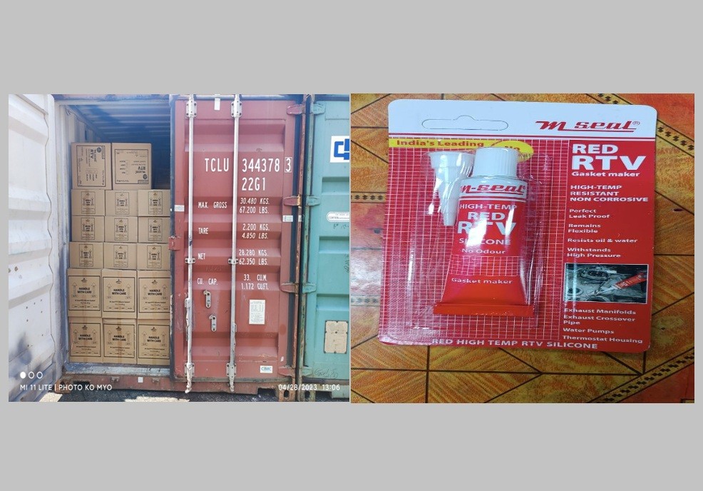 On 4th May, a total of 4,471 kilogrammes of silicone Sealant gasket marker was confiscated from a container at the Asia World Port Terminal container checkpoint and a Sidel brand new blower spare part and an air compressor from luggage at the Yangon International Airport (Import Desk).