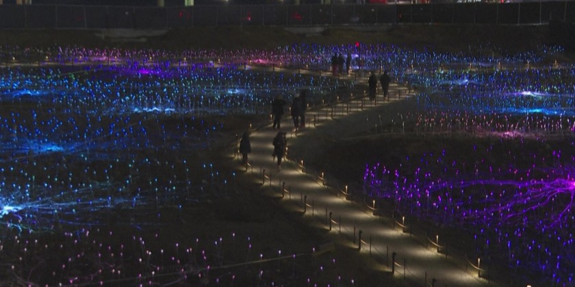 Some 19,000 lowlights illuminate a vacant lot in the heart of Manhattan, like colorful stems blooming into a field of lights.