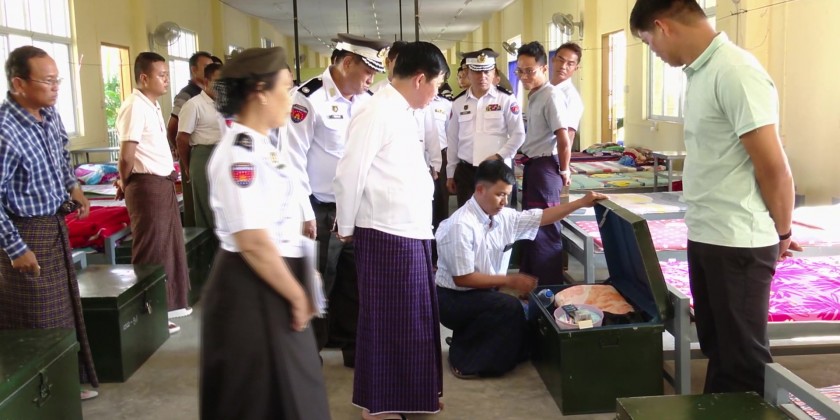 At the Immigration and Population Training School in Dekkhinathiri Township, the Union Minister and party met with departmental staff who have been assigned for duties in Northern Shan State before the terrorist incidents and temporary displaced departmental staff from Northern Shan State fleeing the incidents.