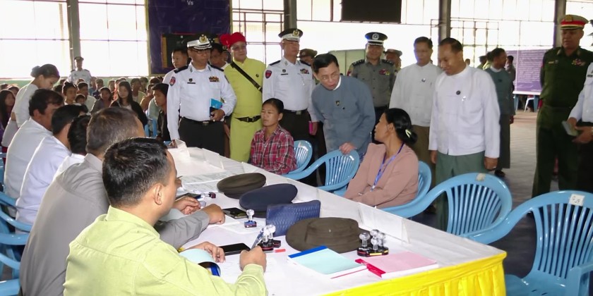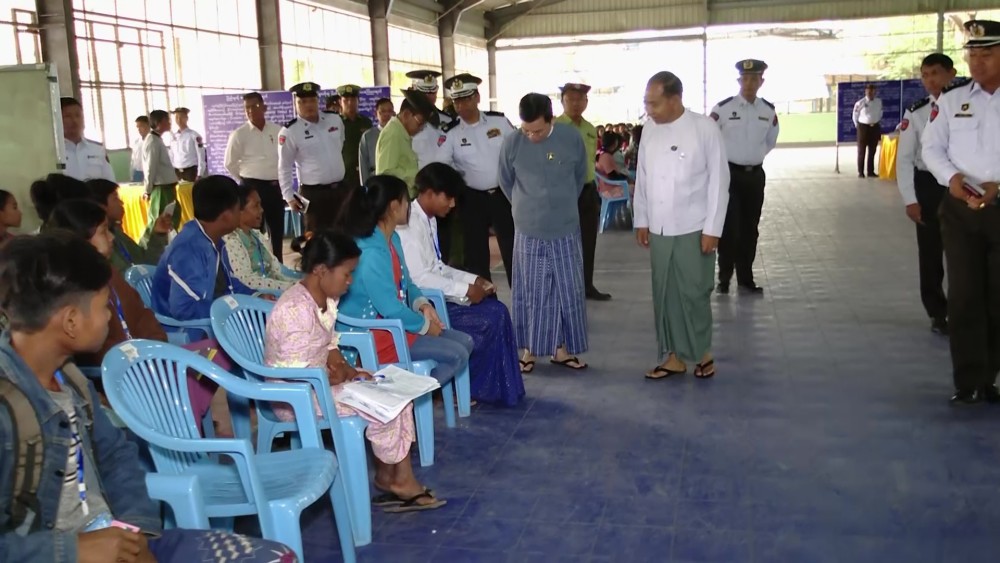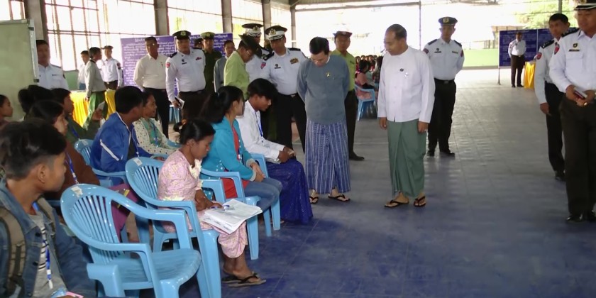 Union Minister for Immigration and Population U Myint Kyaing accompanied by Sagaing Region Chief Minister U Myat Kyaw and officials visited Futsal Sport Ground at Monywa Stadium to conduct field inspection of issuing household lists and National Registration Cards under Pan Khin Project Phase-3.
