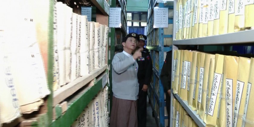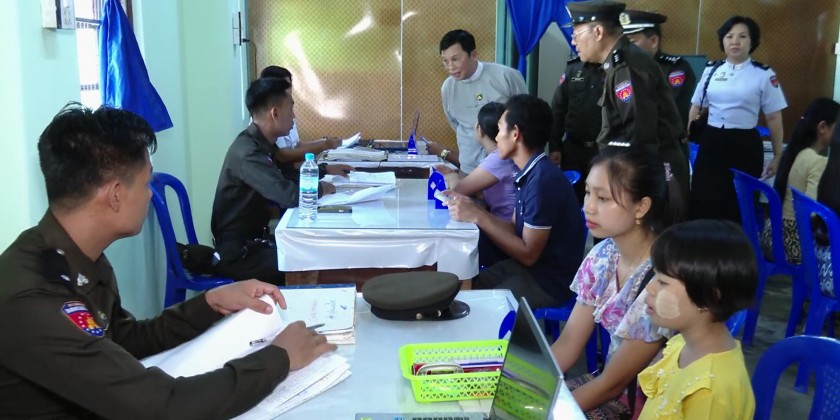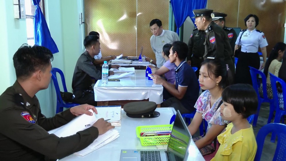 Union Minister for Immigration and Population U Myint Kyaing together with officials visited Myeik Township Immigration Office in Taninthayi Region on Wednesday, to observe the process of issuing national registration cards and UID numbers for e-ID system.