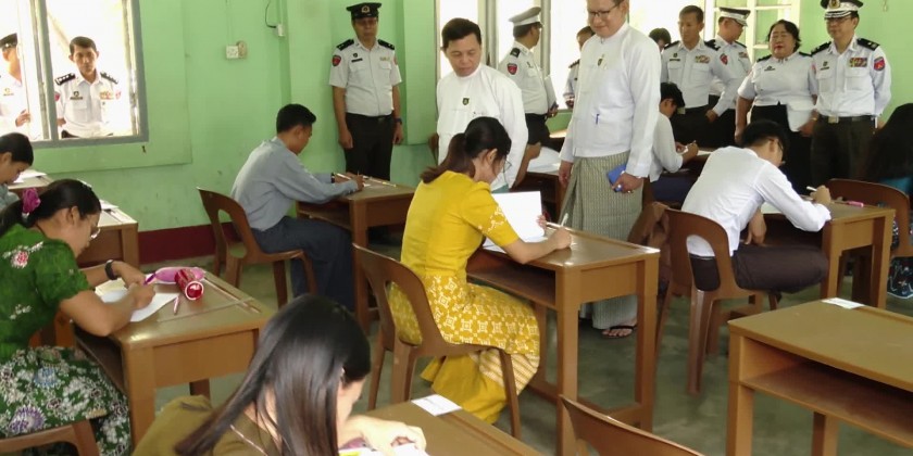 Union Minister for Immigration and Population U Myint Kyaing along with the Deputy Ministers and officials inspected the examinees taking the English tests for new staff position, conducted at No. (5) Basic Education High School, Zabuthiri Township in Nay Pyi Taw.