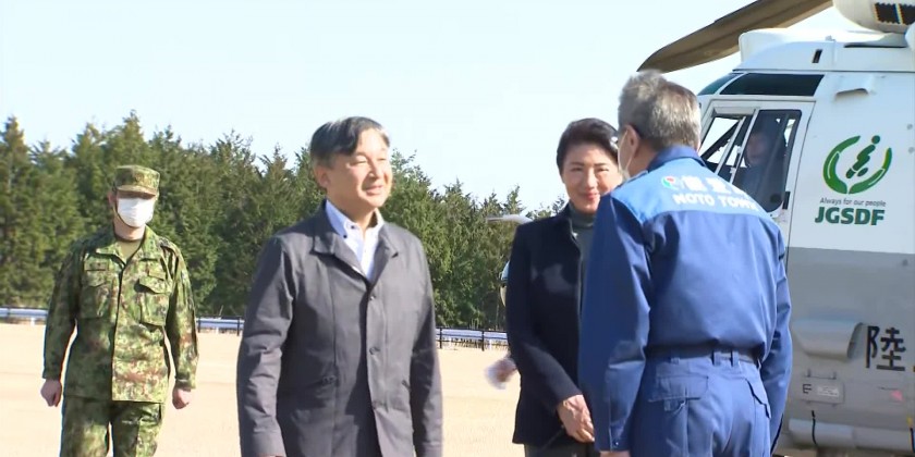 Emperor Naruhito and Empress Masako have visited two towns in Ishikawa Prefecture; Anamizu and Noto that were badly hit by the New Year’s Day earthquake. The Emperor and Empress visited a public facility in the center of Anamizu town where 46 people are still sheltering. They then traveled by helicopter to Noto Town.