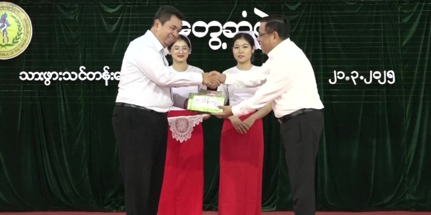 In the evening, the Union Minister, the Chief Minister and party visited the Myeik Midwifery Training School, met with the trainees and provided cash assistance and foodstuff.