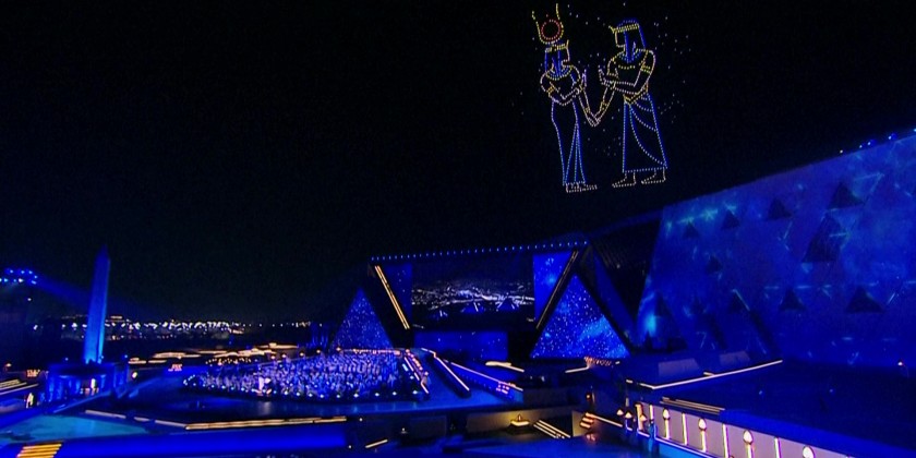 The audience at the opening watched a display of lights and music, with the pyramids towering in front of them. Dozens of performers dressed in elaborate Pharaonic costumes played traditional tunes as a laser show depicting pharaohs and fireworks lit up the night sky above the museum.
