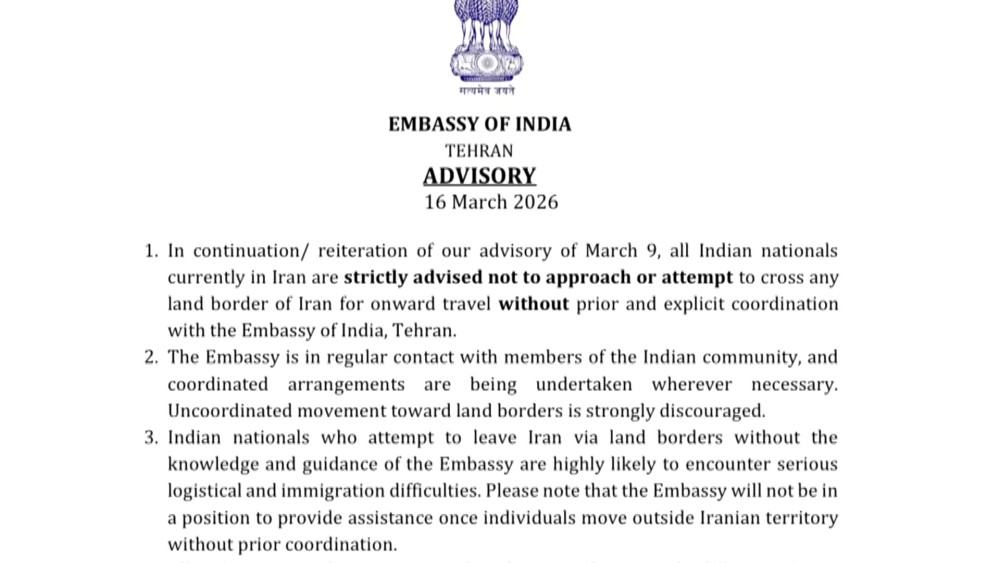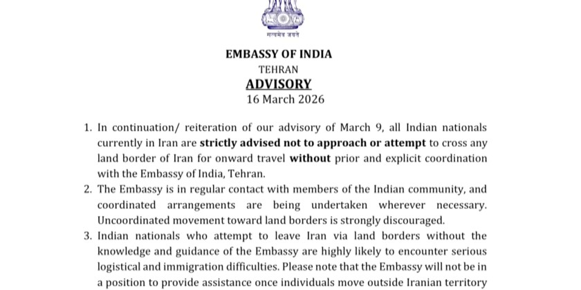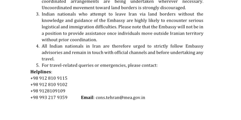 India on Monday asked its citizens currently in Iran not to approach or attempt to cross any land border for onward travel without prior and explicit coordination with the Indian Embassy in Tehran. It said the embassy will not be in a position to provide assistance once individuals move outside Iranian territory without prior coordination.