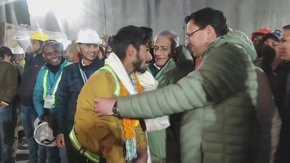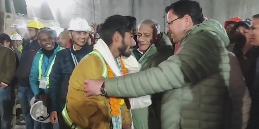 Chief Minister of Uttarakh and and other officials greeted all workers rescued from the collapsed road tunnel after 17-day engineering operation to free them. The rescued men were welcomed as heroes after being hauled through 57 meters of steel pipe on stretchers specially fitted with wheels.