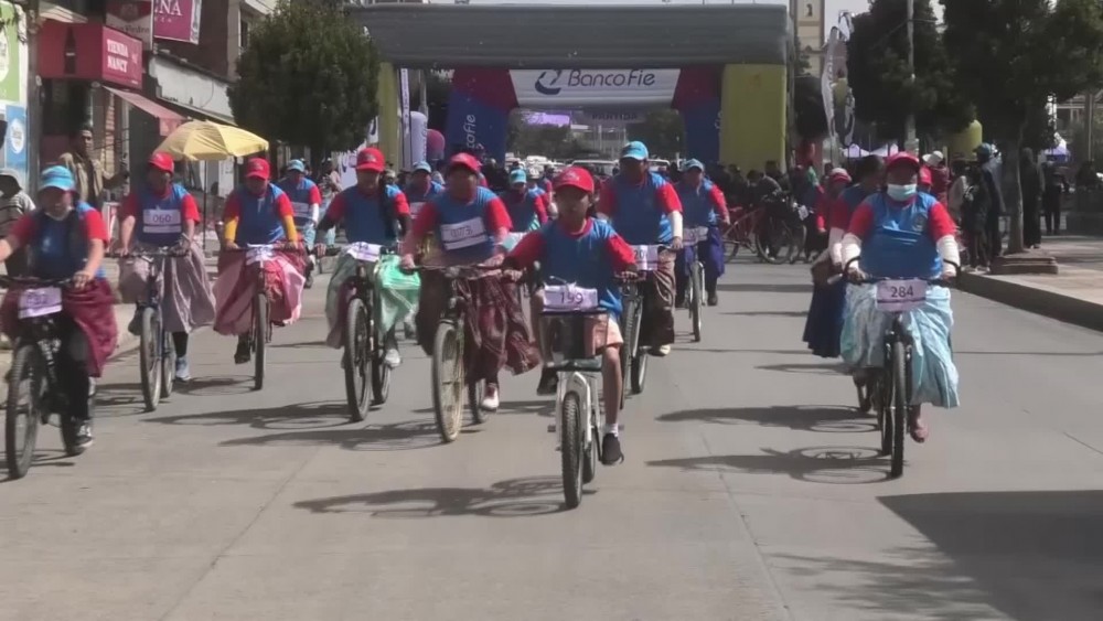Women in the Andean region of Bolivia took part in the "Cholitas bicycle race" on Saturday at more than 4,000 metres above sea level wearing their iconic long, colourful skirts.
