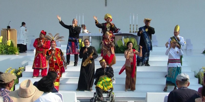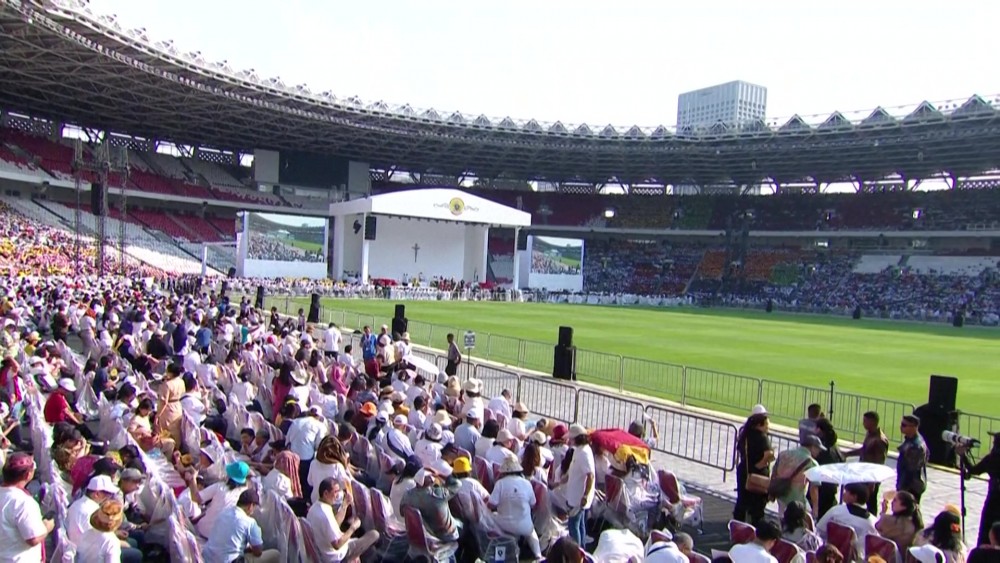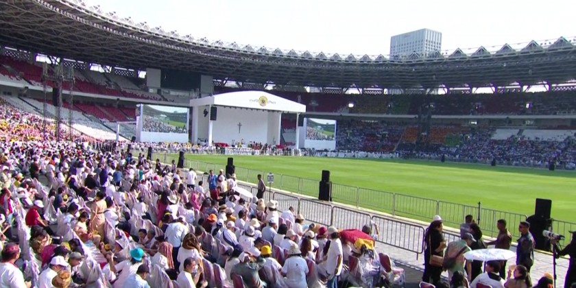 Indonesian President Joko Widodo arrived at the Gelora Bung Karno Stadium, packed with thousands of Catholic devotees attending a Holy Mass to be presided over by Pope Francis. Pope Francis appealed for religious unity Thursday as he addressed tens of thousands of people at a football stadium after meeting faith leaders at Southeast Asia's biggest mosque.