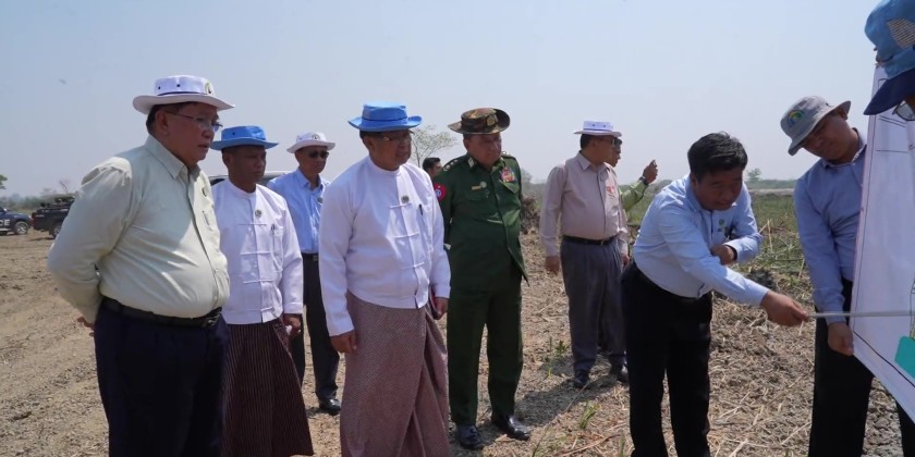 At the temporary briefing hall for the Shwe Tin Tu Agricultural-Livestock Zone and the systematic farmland reclamation project near Shapin Hla Village, relevant departmental officials and construction project representatives briefed the Chief Minister, the Region Hluttaw Speaker, Deputy Speaker, and Region government ministers on the status of project implementation. The Chief Minister provided additional discussions based on the briefings, coordinated necessary matters, and inspected the completed works within the project site.