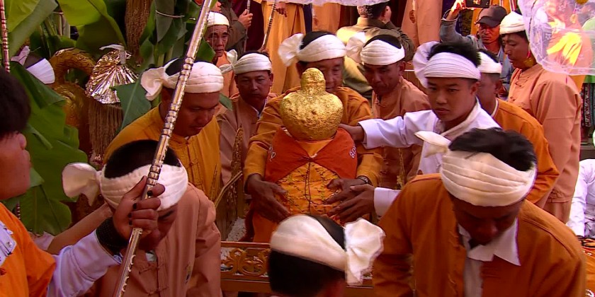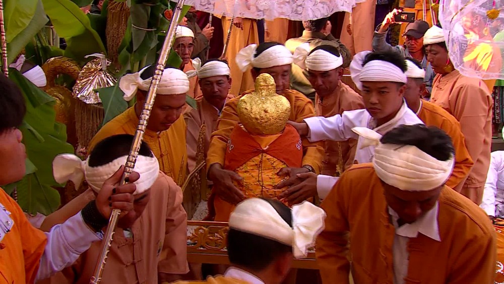 Annually, during the Myanmar month of Thadingyut, four of the Inle Phaung Daw Oo Pagoda Buddha images are placed on a replica of a royal barge and taken throughout Inlay Lake. One image always remains at the Pagoda. The barge is towed by several boats of leg-rowers rowing in unison, and other accompanying boats, making an impressive procession. The barge is towed from village to village along the shores of the lake in clockwise fashion, and the four images reside at the main monastery in each village for the night.