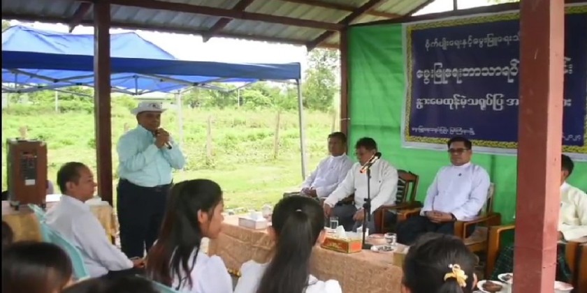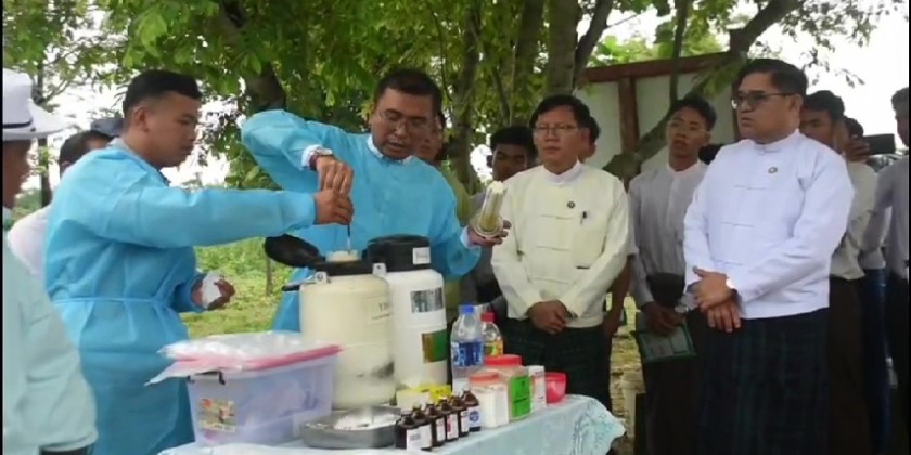 Next, the Chief Minister provided cash assistance for the instructors and demonstrators and trainees. Then, the Chief Minister attended the demonstration of artificial insemination in cattle, heard the clarification of Director Dr. Than Aye of the Department of Livestock Breeding and Veterinary about the artificial insemination, provided medicines for livestock breeding to the trainees and viewed the artificial insemination.