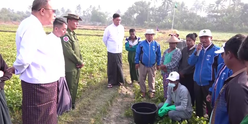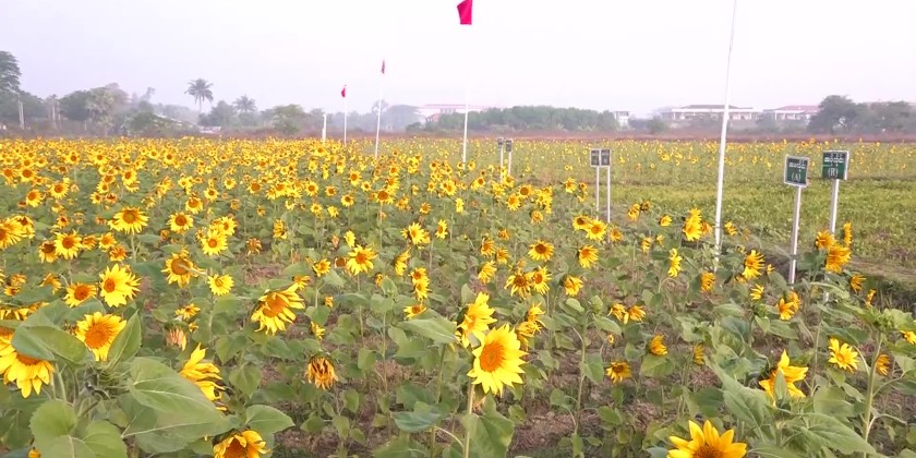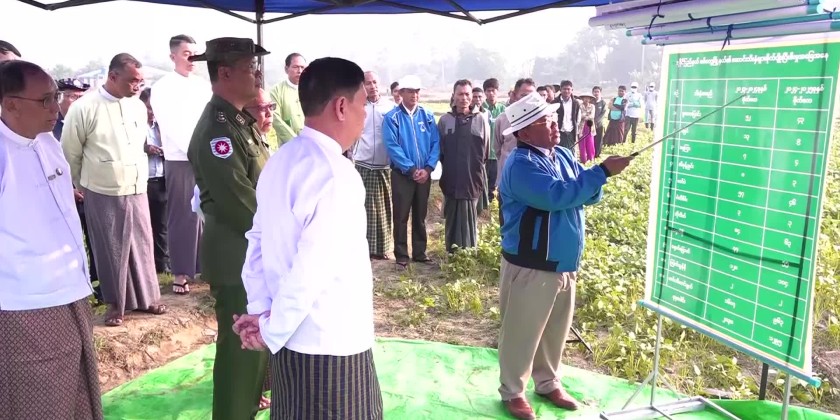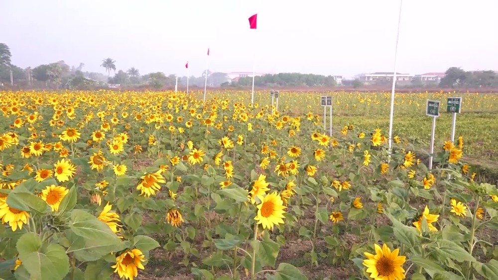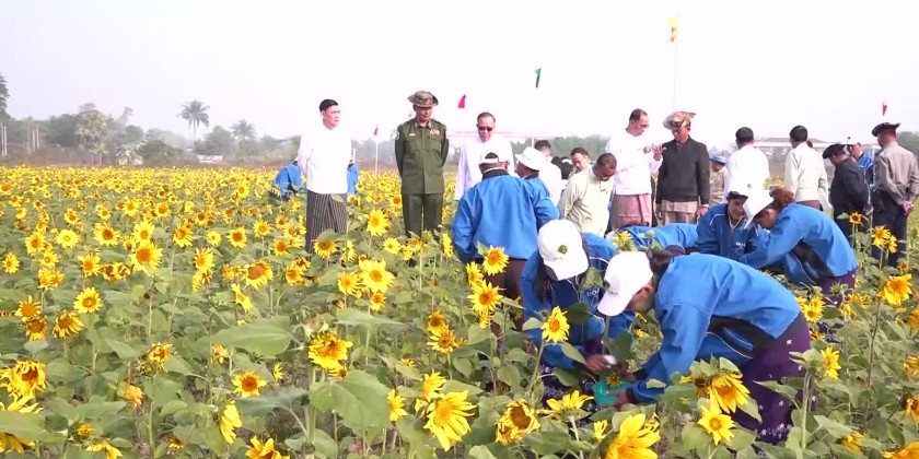 Supervised by the Rakhine State Government, the field demonstration of the supplemented pollination for Yezin hybrid strain-1 of sunflower and urea-borex mixed fertilizer was held at the model plot in West Sanpya Ward of Sittwe on January 28 and attended by the Chief Minister U Htein Lin, State Government members, departmental officials, staff from the Department of Agriculture and farmers.