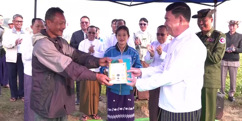 First, the Chief Minister U Htein Lin presented vegetable seeds and agricultural education books to the farmers.
