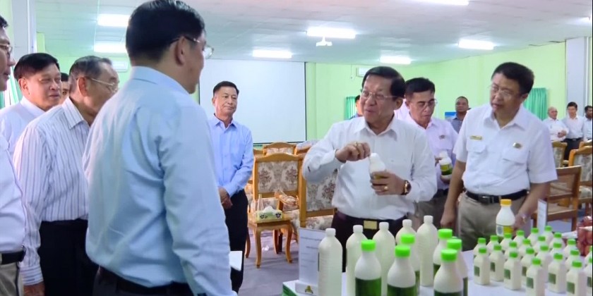 Next, the SAC Chairman and party looked the samples of fish species breeding in the Thilawa multipurpose agriculture and livestock farming zone and the eggs and dairy products of agricultural and livestock breeding farms.